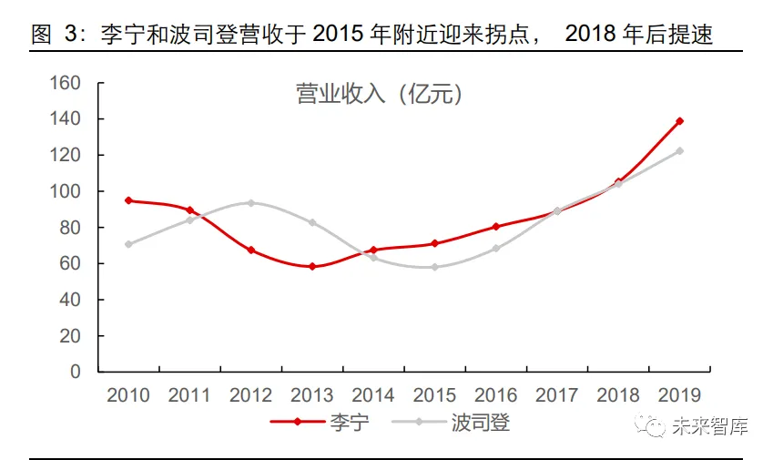 李宁品牌是“体操王子”李宁在 1990 年创立的同名品牌,早期借助于创始人的明星光 环、重量级体育营销资源的加持以及经销模式的快速扩张,李宁品牌经历了近 20 年的 黄金发展期,并于 2009 年超越 adidas 成为仅次于 NIKE 的中国市场第二大运动品牌。但前期粗犷发展的弊端在 2011 年行业增速放缓后开始加速显现,公司自此进入内部变 革阶段,分别经历了张志勇、金珍君和李宁三任领导者;但受到定位失误、管理低效、 执行力不足等多因素影响,前两次变革均宣告失败,创始人李宁于 2015 年回归后,逐 渐带领李宁走出泥沼,业绩拐点开始显现。而 2018 年初,“中国李宁-悟道系列”产品 于纽约时装周的惊艳亮相,带领这个创立近 30 年的品牌重回大众视野,引发媒体与大 众热议,叠加过去数年公司改革红利的逐步释放,公司业绩及股价表现亮眼。2019 年, 公司实现营收和归母净利分别为 139 和 15 亿元,同比增长 32%和 110%;公司股价自 2018 年初至今,涨幅超过 300%,成为本轮鞋服领域“国货崛起”的典型代表。