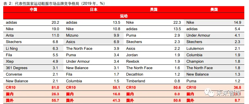 我们认为,运动鞋服主要应用于体育活动及比赛场景,具有专业化和功能化的特征,产 品相对标品,易形成高集中度。基于技术研发提升产品功能性,通过与核心体育赛事、 体育明星资源绑定进行品牌营销,是运动鞋服品牌商竞争的核心要素。不同于音乐、影 视等艺术作品具备较强的地域属性,体育是一项跨地域、全球化的活动,奥运会、NBA、 世界杯、欧洲杯等体育赛事,詹姆斯、梅西、贝克汉姆等体育明星均具备全球性的影响 力,头部品牌对核心体育营销资源的瓜分,使得不同国家运动鞋服行业格局表现出一定 的相似性,头部运动品牌表现出全球竞争力的特征。