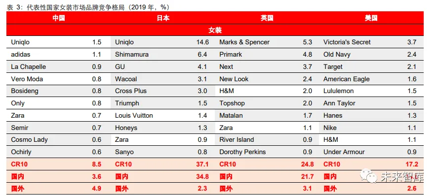 我们认为,女装是一个高度时尚化的细分品类,且受潮流趋势、文化背景等因素影响更 为明显,故行业集中度显著偏低;同时,品类特点也决定了品牌商需对当地的消费者文 化需求、消费偏好、穿着体验等深度理解、具备灵活的供应链反应速度、渠道规模和效 率优势等,一定程度具有“渠道品牌”的特征,因此扎根本土市场的品牌具有相对优势。对于中国女装市场而言,市场规模大、区域间发展不平衡导致不同层级城市的消费偏好 差异明显,进而中国女装消费市场的集中度显著低于其他国家;而本土服装品牌发展起 步又相对较晚,亦经历了库存危机后的深度调整、海外品牌冲击、渠道偏见等,进而本 土女装品牌市场份额相对更低。