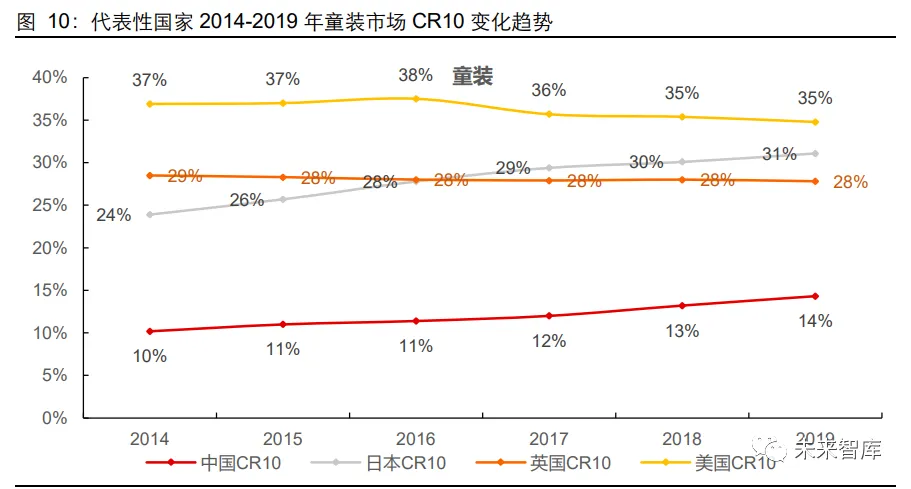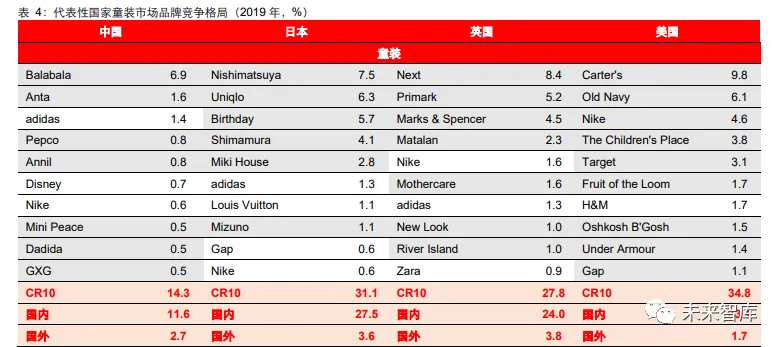 除日本市场外,其余市场均呈现出童装行业 CR10 显著高于女装行业,同时,童装行业 的竞争格局与成人装呈现出一定的相似性:本土品牌市占率水平明显高于国外品牌,以 及童装市占率靠前的品牌与成人装品牌呈现出部分重叠。