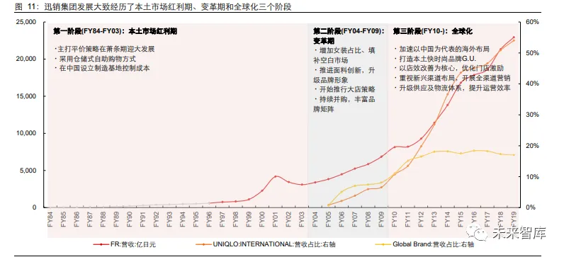 以 2010 年为界,FR 前期发展以 UNIQLO 主品牌为主且更重视日本本土市场挖潜;后 期则更加重视多品牌矩阵以及亚洲市场为主的全球化渠道扩张。截至 2019 财年, UNIQLO 品牌海外市场收入占比达 45%。此外,其早期多品牌并购整合效果不佳拖累业 绩表现,公司于 2011 年调整策略,通过自创品牌 G.U.为主打本土平价快时尚的品牌填 补市场空白。