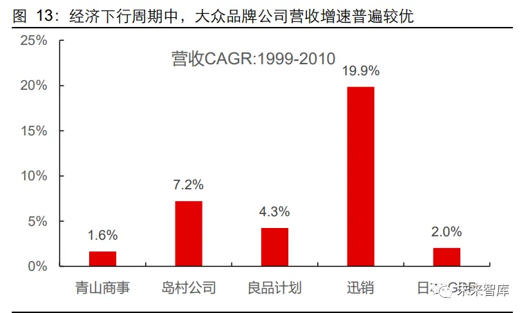 优衣库诞生于 1984 年,主打平价策略,并创新性的采用仓储式自助购物方式,顺应萧 条背景下平价化及品质升级的发展趋势。90 年代以来,日本劳动参与率持续降低、家 庭收入水平降速甚至负增长,家庭负债率持续提升,居民收入差距扩大;在此背景下, 家庭消费支出萎缩,居民消费偏好步入平价时代,消费偏好由品牌导向转化为追求品质 升级。从微观数据来看,代表性奢侈品公司在日本市场的营收体量几乎陷于停滞,而以 迅销、岛村公司(饰梦乐母公司)以及良品计划(MUJI 母公司)为代表的平价大众品 公司快速崛起。
