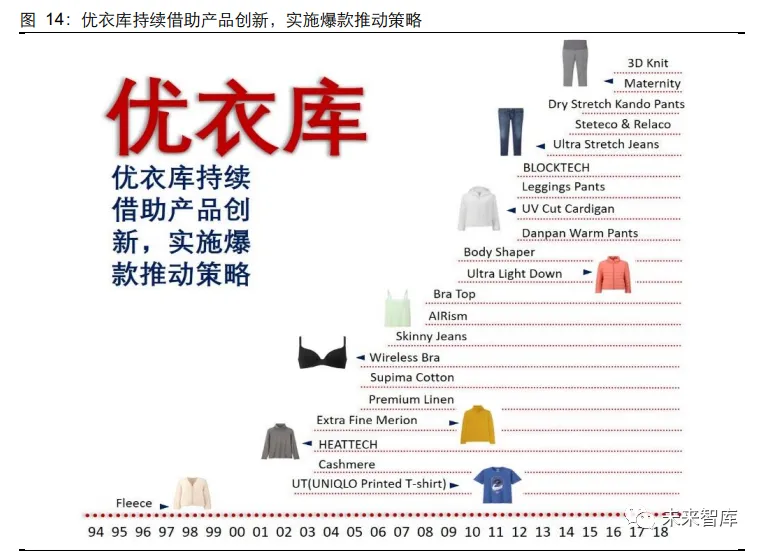 产品是服装品牌赖以竞争的核心,优衣库的发展也伴随着外部环境和自身经营策略变化, 持续进行产品升级迭代,强化产品力。优衣库的产品发展大致经历了三个阶段: