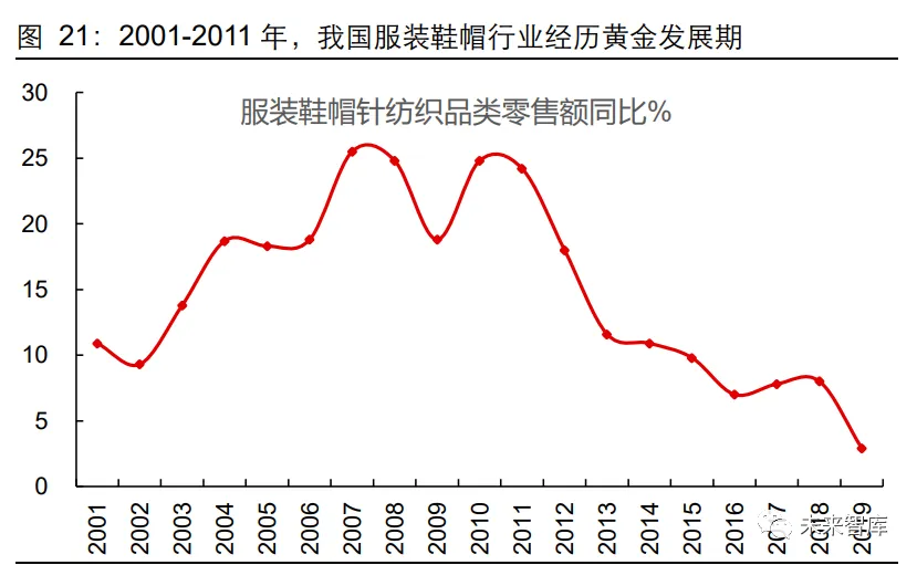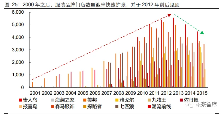 以中国 2001 年加入 WTO 为关键节点,进入 2000 年后,中国经济快速发展、城镇化加 速,人均 GDP 快速提升,消费迎来黄金发展期;2001-2011 年,国内限额以上服装零 售额维持约 20%的快速增长。在此阶段,本土品牌和国外品牌均迎来了发展的黄金阶 段,一方面依靠“明星代言+央视广告”的方式打响全国的品牌知名度,另一方面依靠 轻资产的经销模式实现全国范围内的快速扩张。安踏、李宁、美特斯邦威、贵人鸟等品 牌巅峰时期在国内的门店数量均超过 4000 家,而海外品牌中,以佐丹奴、真维斯、堡 狮龙、班尼路等休闲服品牌为代表,亦在国内市场遍地开花。这一阶段,行业的发展特 征体现为“跑马圈地”,收入增长主要依靠门店扩张驱动,但过于粗放的发展模式也为之 后行业库存危机的爆发埋下了隐患。