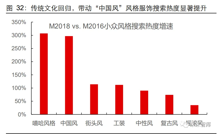 综上来看,我国鞋服行业在经历了“供给缺乏的无品牌阶段”、“标牌向品牌的过渡阶段”、 “品牌化服装发展的黄金阶段”及“内忧外患下的深度调整阶段”后,在民族自信提升 及传统文化回归的社会文化背景、传播媒介变更及消费者年轻化所带来的消费者心智变 化、传统渠道偏好度提升及新兴电商渠道提供发展新机遇,以及品牌商苦炼内功及尝试 创新性模式因素共同推动下,国货服装品牌正迎来快速崛起。
