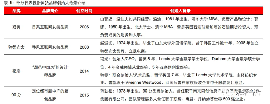 同时,不同于早期诸多服装品牌多以加工制造起家,创始人对于现代化企业管理及品牌 建设的知识相对匮乏,而目前诸多新创的“新国货”品牌,初创团队相对年轻,学历水 平高、具有海外留学经历或金融、互联网等世界 500 强企业工作经历,更加理解新生代 的消费者需求以及现代化企业管理运营等。以 90 分品牌为例,品牌创始团队多具有名 校背景及 IT 世界 500 强企业工作经历,品牌创立初期并未采取传统的“广告投放+线下 店模式”,而是借力小米生态链体系和上亿的小米用户群,迅速打响 90 分品牌知名度, 从 2015 年成立到 2018 年,GMV 超 10 亿元,实现对传统箱包品牌的降维打击。以本 土快时尚的代表 URBAN REVIVO 为例,2006 年创立于广州,创立初期即采取谨慎扩 张的策略,以快时尚 DNA 为核心进行发展模式的探索,品牌以“奢华大店、产品丰富、 更新快速和价格实惠”为定位,具备极速的供应链管理系统,实现了 10 天的前导时间、 每年推出万款新品、每周每店更新两次货品的高效上新速度。