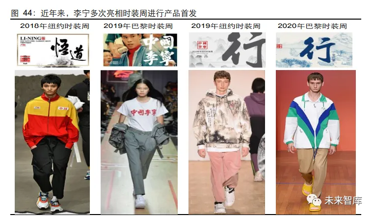 总结李宁 2018 年以来的强势崛起,从产品风格来看,李宁品牌立足本土市场,充分挖 掘中国传统文化元素,将中国文化中的复古潮流元素与产品研发设计结合,推出了中国 李宁这一定位中高端的产品线,顺应了这波运动时尚风潮及国货崛起的大趋势,精准契 合了消费需求。在产品品类上,选择以时尚度更高、进入门槛较低的服装品类为切入点, 与海外巨头以运动鞋为主而运动服则以专业化和街头潮流风格为主的定位,实现了差异 化竞争。在营销宣传上,摒弃了专业化运动品牌通过赞助体育赛事及体育明星的方式, 而是采取更类似于时尚品牌的方式,将时装周作为新品首发地点,成为国内首个登上国 际时装周的运动品牌;同时,与时尚潮流媒体深度合作、明星带货挖掘粉丝经济、签下 知名说唱明星 GAI 推出联名球鞋、收购电竞战队 Snake 等,在营销上增强品牌的时尚 属性和适应不同圈层。在销售方式上,也选择了更为契合所定位的年轻消费群体消费方 式、距离消费者距离更短的电商渠道进行发售;同时,也选择了在高端商圈开展快闪店 等方式,吸引年轻消费群体。