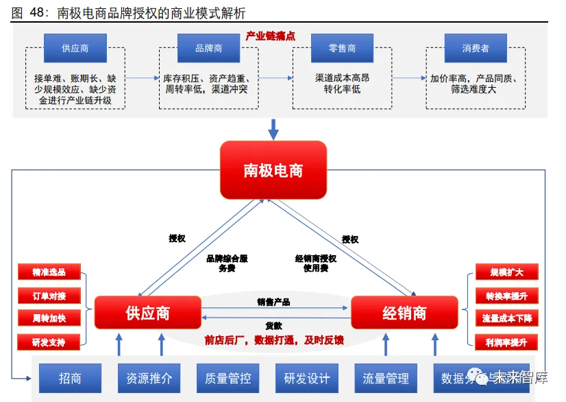 层层加价的传统产业链低效、痛点频发,南极电商基于模式创新有效解决行业痛点。以 传统服装产业链为例:1)供应商层面,中小型供应商接单难、回款周期长、缺乏规模效 应、缺少资金进行产品研发及产业链升级,而中大型供应商大规模、批量化、长周期的 生产模式与快速变化的消费者需求亦存在一定冲突;2)品牌商层面,数据决策系统的 缺乏及较长的前导周期,致产品无法精准匹配终端需求、适销性差、库存积压、周转效 率低;同时,国际品牌、网红品牌等的兴起也在加剧竞争;3)零售商层面,流量入口愈 发分散、电商流量红利衰减,渠道及人工等各项成本上升,转化率降低;4)消费者层 面,传统线下渠道产品加价率过高,而电商渠道又面临体验性较差,产品同质化致筛选难度大等诸多痛点。南极电商通过聚焦于中、高频消费的日用生活标准品领域,向供应 商及经销商双向授权,并提供包括资源对接、质量管控、研发设计、流量管理、数据分 析与应用等多项服务,实现整体产业链效率及盈利的提升。基于产业链重构,南极电商 较好的解决了供应商接单难、品牌商库存积压、零售商流量成本高企转化率低等问题。