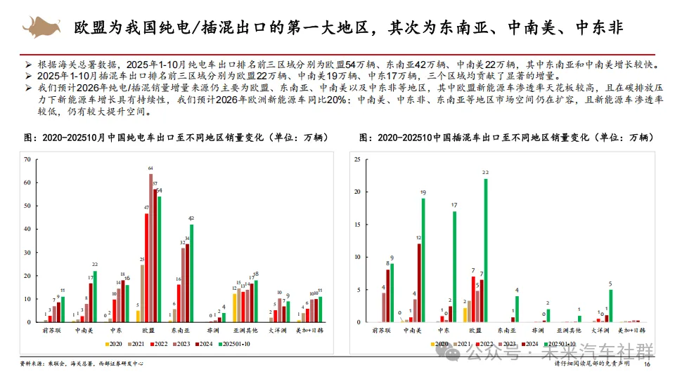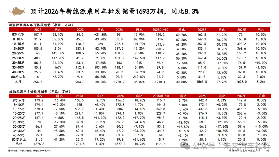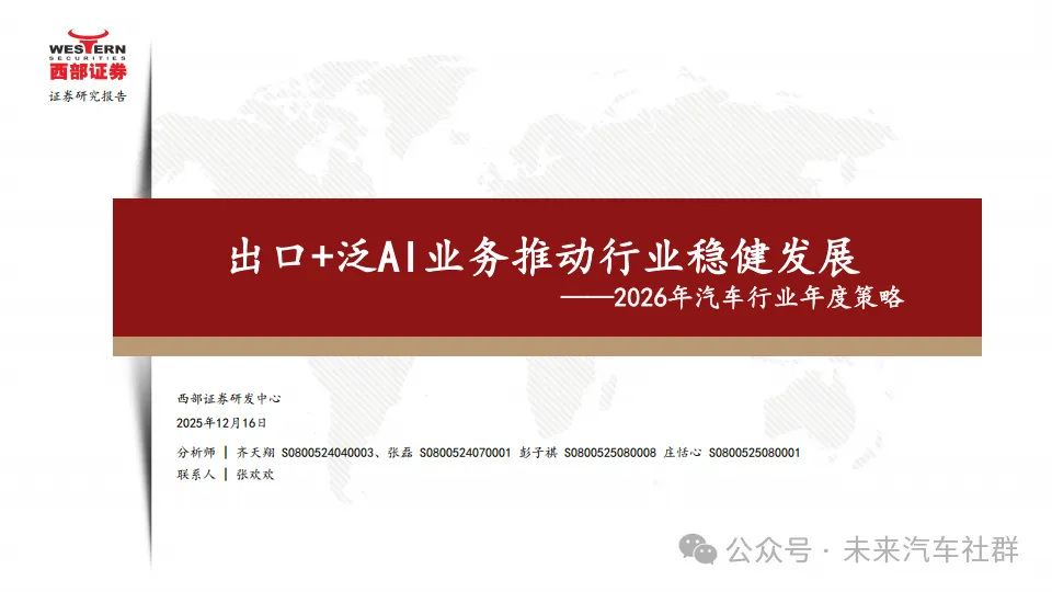 本次研究基于乘用车、商用车、两轮车、汽车零部件、汽车后市场五大模块对2025年行业变化进行深度复盘,并对2025年作出展望,围绕出口+泛AI业务,提出整车层面2026年核心投资方向在于出口及中高端化,重点关注整车企业入局人形机器人业务;零部件方面核心投资方向为一体两翼,一体为聚焦主业,核心在于智能化,出口业务或者其它国产化替代加速的细分板块,两翼则为人形机器人与AIDC相关(液冷或服务器电源)的泛AI新业务,展翼而起,新业务有望提升资本市场对龙头公司未来发展成长的预期。同时本研究也就商用车重卡、商用车客车,两轮车以及汽车后市场等板块进行了讨论。