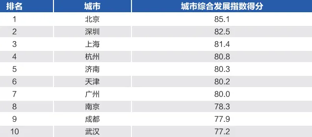 创新城市测度选取20个创新城市特征指标,聚焦技术创新力、成果转化力、创新治理力、原始创新力、创新驱动力等方面开展评估。评估结果显示,我国现阶段创新城市建设呈现“整体偏优,差异显著”特征,排名前十的城市依次为北京、深圳、上海、南京、杭州、广州、武汉、长沙、天津和济南。