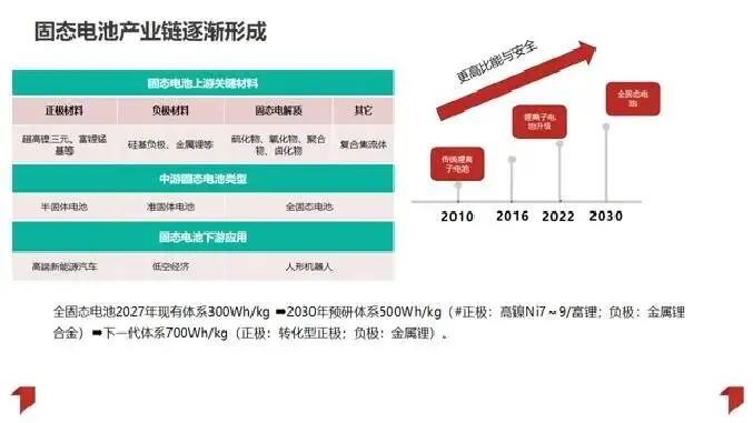 与传统液态锂电池相比,固态电池以固态电解质取代易燃电解液,从根本上解决了热失控风险,兼具能量密度高、安全性强、快充潜力大、宽温域适应等核心优势。其能量密度有望从当前液态三元电池的300Wh/kg跃升至500Wh/kg甚至700Wh/kg,为高端电动车、电动飞行器、人形机器人和航空航天提供终极动力解决方案。报告指出,硫化物电解质因具备接近液态电解液的离子电导率,已成为中日韩头部企业共同聚焦的技术主流,而氧化物与聚合物路线则在半固态领域率先实现商业化落地。