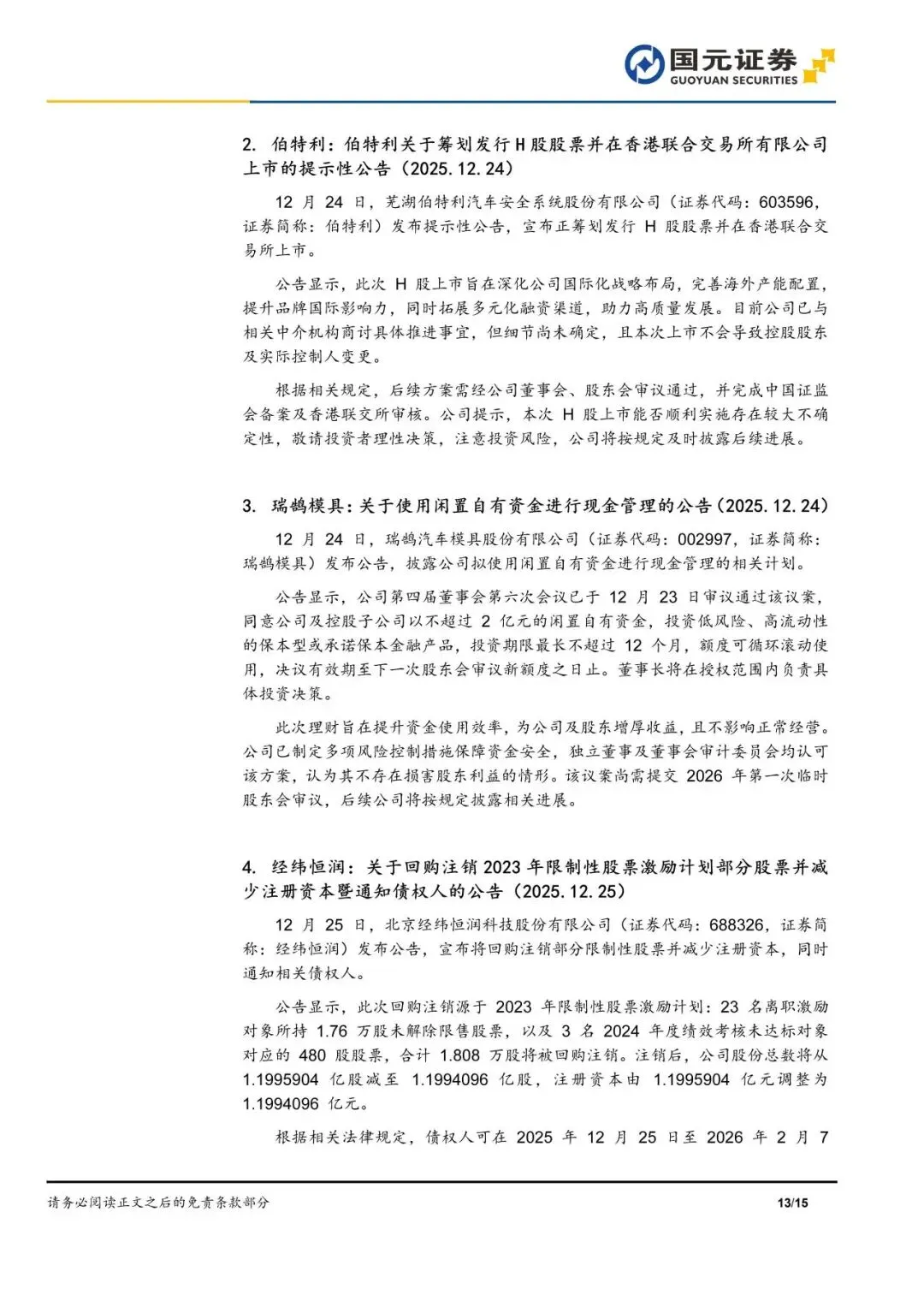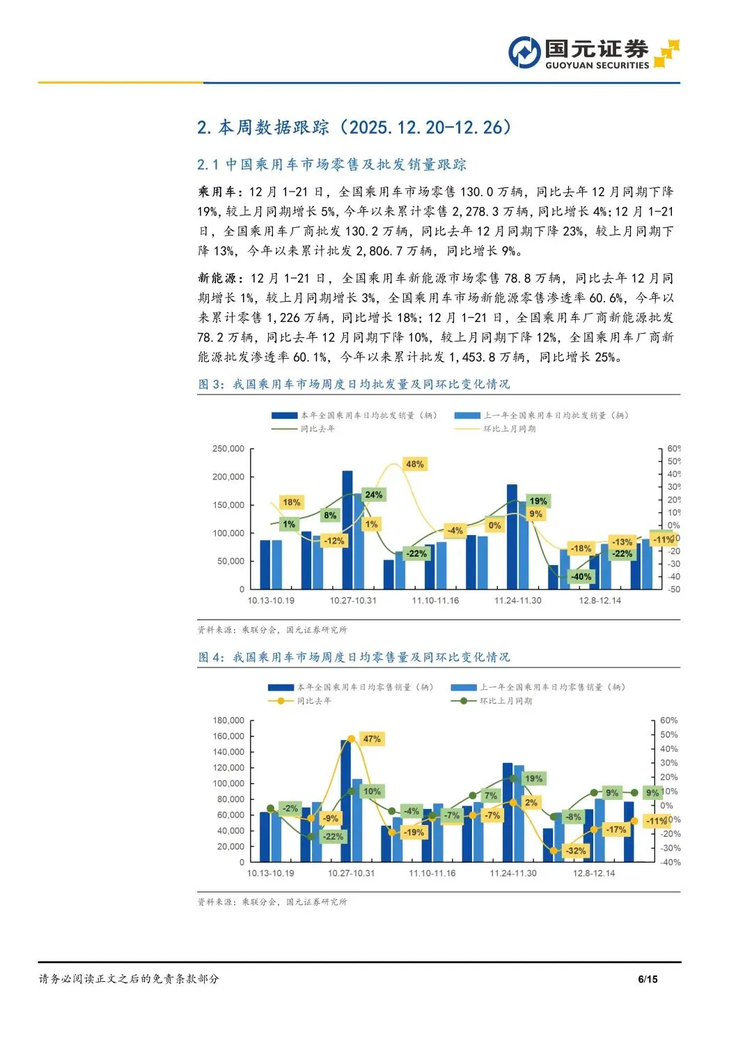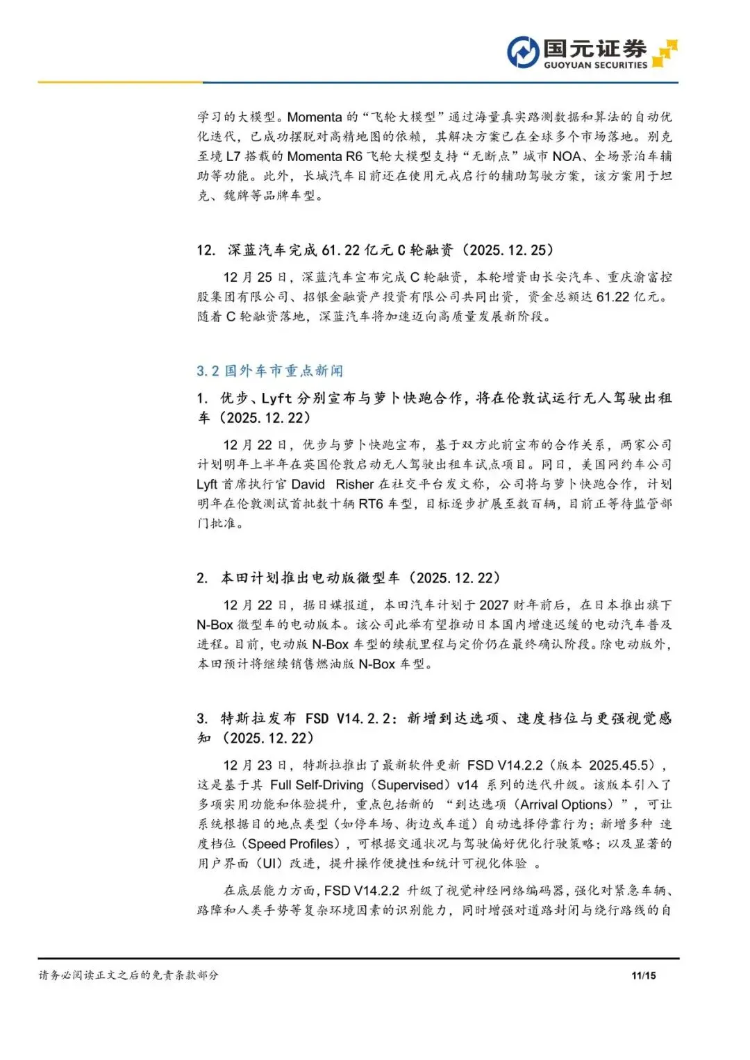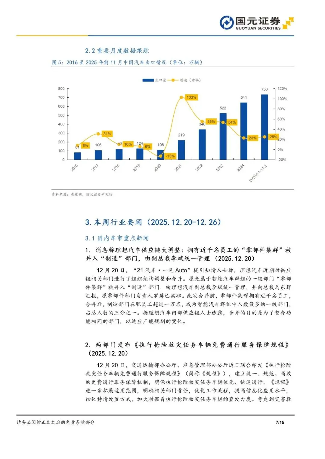 本报告摘自国元证券2025年12月29日已发布的《“十五五”汽车持重,智能豪华定义新方向——汽车行业周报》,具体报告及分析内容请详见报告。若因对报告的摘编等产生歧义,应以报告发布当日的完整内容为准。