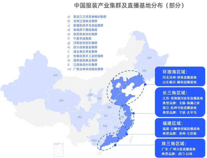 长三角区域,有江苏-常熟墨河皮草直播基地,典型品牌有无锡的海澜之家,还有浙江-杭州屯和直播基地,典型品牌有宁波的太平鸟。福建区域,有福建-石狮青创城直播基地,典型品牌为泉州的七匹狼。珠三角区域,有广东-广州火星直播基地,典型品牌为虎门的以纯。