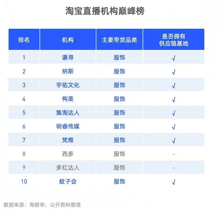 服饰行业不仅有丰富的产业集群,还有丰富的供货渠道,比如,供应链基地、服装档口、B2B平台、平台商品池等。这些供货渠道提供了丰富的货源,可以满足不同主播的供货需求。还有些头部MCN并不满足于这样的供应链,正在尝试打造自有供应链体系。据不完全统计,淘宝直播排名前十且主要带货服饰品类的机构中,有八家拥有自建或注资的供应链货源基地。比如,头部MCN机构谦寻,在杭州筹建了“超级供应链基地”,覆盖服饰在内的全品类优质货源。值得一提的是,服装电商的发展,推动了服饰产品供应链走向柔性。目前来看,服饰柔性供应链的应用方面主要有两大方向。一方面,打通销售端与生产端数据,通过大数据分析获取用户需求及市场变化信息,紧跟市场反馈调整生产节奏,降低库存风险,提高转化效率。另一方面,由于单一款式、大批量、少批次的传统服饰生产模式无法满足直播场景下的用户需求,供应商主动调整生产模式,缩短上新周期,提高上新频率,向多款式、小规模、多批次的生产模式转变。如今,已经有一些平台在服饰柔性供应链应用方面走在了前列。据川报观察报道,数字化智能化制造平台“犀牛智造”,相较传统工厂,能够缩短75%的交货时间、降低30%的库存。为了在服饰领域的竞争中取胜,淘快抖纷纷拿出自己的杀手锏。淘快抖不仅纷纷深入产业上游,培育源头商家,提供发展指导,还纷纷推出扶持政策,策划专场活动,助力商家变现。比如,淘宝出台“服饰商家激励政策”,降低开播门槛,为服饰主播提供流量倾斜;抖音发布“种子计划”,面向服装鞋包等五大品类入驻的商家,提供零门槛开通直播购物车、流量扶持、服务费减免等多项优惠政策;快手公开“服饰商家流量扶持计划”,针对新晋服饰品牌开启扶持,并招募时尚类MCN。我们先来看两组新榜联合第一财经商业数据中心发布的数据:今年7月,服装鞋帽带货王TOP20的主播中,淘宝占了13席,且前五名全部来自淘宝,分别为南风Cheney、薇娅viya、陈洁kiki、烈儿宝贝、雪梨。今年8月,服装鞋帽带货王TOP20的主播中,淘宝占了11席。TOP5中,有4名主播来自淘宝,分别为薇娅、陈洁kiki、烈儿宝贝、雪梨。由此可见,在服饰直播电商领域,淘宝暂时领先,快手、抖音则紧随其后。具体来说,淘宝在直播领域有先发优势,平台生态也更为成熟,服饰已成为淘宝的优势类目。据优大人数据,淘宝直播中,穿搭类直播占比达23%。4月场均观看人数在10万以上的主播中穿搭主播占比达34%,在淘宝直播所有品类中规模最大。快手的一大特色在于,聚集了大量线下服饰批发商转型的主播,如“徐小米”、“芈姐”,为快手带来了丰富多样的白牌服饰商品。快手8月热销TOP100服饰商品中,白牌商品占比达77% 。而抖音直播电商起步较晚,整体规模不及淘宝、快手,但通过布局发展,已经在市场占据了一席之地。目前抖音平台服饰主播梯队还未定型,新入局者仍有较大的发展空间。通过研究服饰在供应端和渠道端的情况,我们得出以下结论:从供应端的角度来说,服饰行业有两个明显特点,一是线下产业集群丰富,且集中于东部。值得注意的一个现象是,头部的MCN的机构,正在积极渗透到服饰产业链中去。二是服饰直播电商的发展,正在推动服饰供应链变得更加柔性。从渠道端的角度来说,服饰是淘快抖等主流平台的重点扶持的品类。不过,淘快抖各有特点,淘宝在直播领域有先发优势,平台生态也更为成熟;快手的白牌服饰影响力突出;抖音的流量蓝海优势明显,主播梯队仍未定型。在下篇文章中,我们将聚焦服饰行业直播电商的运营端和需求端,欢迎继续关注。