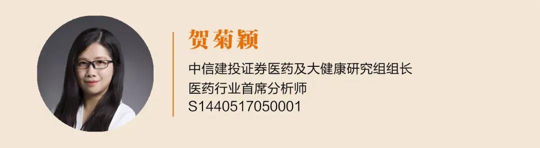 贺菊颖:中信建投证券医药行业首席分析师,复旦大学管理学硕士,10年以上医药卖方研究从业经验,善于前瞻性把握细分赛道机会,公司研究深入细致,负责整体投资方向判断。2020年度新浪财经金麒麟分析师医药行业第七名、新财富最佳分析师医药行业入围、万德最佳分析师医药行业第四名等荣誉。2019年Wind“金牌分析师”医药行业第1名。2018年Wind“金牌分析师”医药行业第3名,2018第一财经最佳分析师医药行业第1名。2013年新财富医药行业第3名,水晶球医药行业第5名。