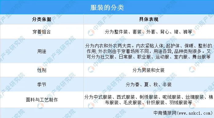 服装是衣服鞋装饰品等的总称,多指衣服。在国家标准中对服装的定义为穿于人体起保护和装饰作用的产品。人类最初的衣服多为兽皮,随后逐渐发展为用麻和草等纤维制成织物。当前,服装已经发展成为遮体、装饰的生活必需品,人们对服装的消费需求日益多元化,造就了服装品类的多样化。