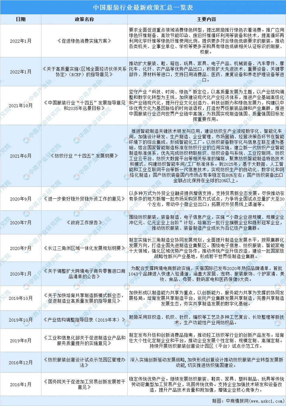 近年来,我国出台了一系列政策推进服装行业的发展,《促进绿色消费实施方案》《关于高质量实施<区域全面经济伙伴关系协定>(RCEP)的指导意见》《中国服装行业“十四五”发展指导意见和2035年远景目标》《纺织行业“十四五”发展纲要》《工业和信息化部关于促进制造业产品和服务质量提升的实施意见》等政策为促进服装行业发展提供了政策支持。具体政策如下: