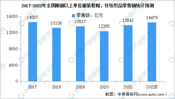 经过多年的发展,中国服饰行业已从外延扩张式为主的快速发展阶段步入内生式为主的优化发展阶段,增速相对放缓。2021年纺织品服装内需市场稳步恢复,对行业经济运行平稳回升的拉动作用增强。根据国家统计局数据,2021年全国限额以上服装鞋帽、针纺织品类零售总额达13842亿元,同比增长12.7%。预计2022年全国限额以上服装鞋帽、针纺织品类零售总额达14479亿元。