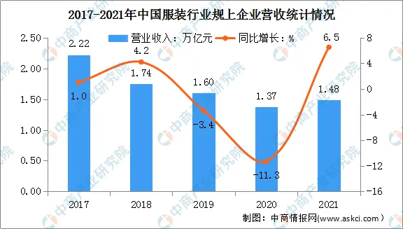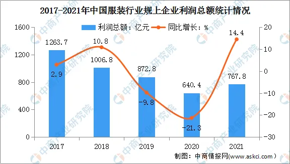 近年来,由于企业经营状况的变化以及大众化业务集中化,我国服装行业规模以上企业(年主营业务收入2000万元及以上)的数量呈现逐年下降的趋势,由2017年的15825家降至2020年的13300家。最新数据显示,2021年我国服装行业规模以上企业降至12653家,同比下降4.9%。