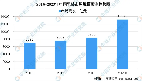近年来,中国男装市场发展态势良好。2016-2018年,我国的男装行业市场规模逐年增加,2016年国内男装行业市场规模达6876亿元,有望在2018-2023年间复合增速达到9.6%,预计2023年中国男装行业市场规模增至13070亿元。