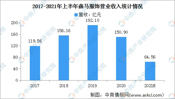 2020年森马服饰致力于产品研发和创新,实现营业总收入约152.05亿元,较上年同期减少21.37%;实现归母净利润8.06亿元,同比减少48%,其中森马服饰在服装行业实现营收150.90亿元,占总营收的99.24%。数据显示,2021年上半年,森马服饰在服装行业实现营收64.56亿元,占总营收的99.08%。