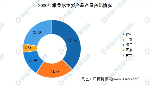 从产品产量来看,2020年雅戈尔的衬衫产量558.63万件,同比下降19.53,但在公司主要产品产量中占比仍最大,占比达37.7%,其次上衣、裤子和西服的占比分别为21.4%、14.0%以及4.8%。