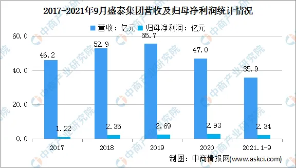 数据显示,2020年盛泰集团实现营收47.0亿元,同比下降15.57%;实现归母净利润2.93亿元,同比增长9.01%。2021年前三季度,盛泰集团实现营收35.9亿元,实现归母净利润2.34亿元。