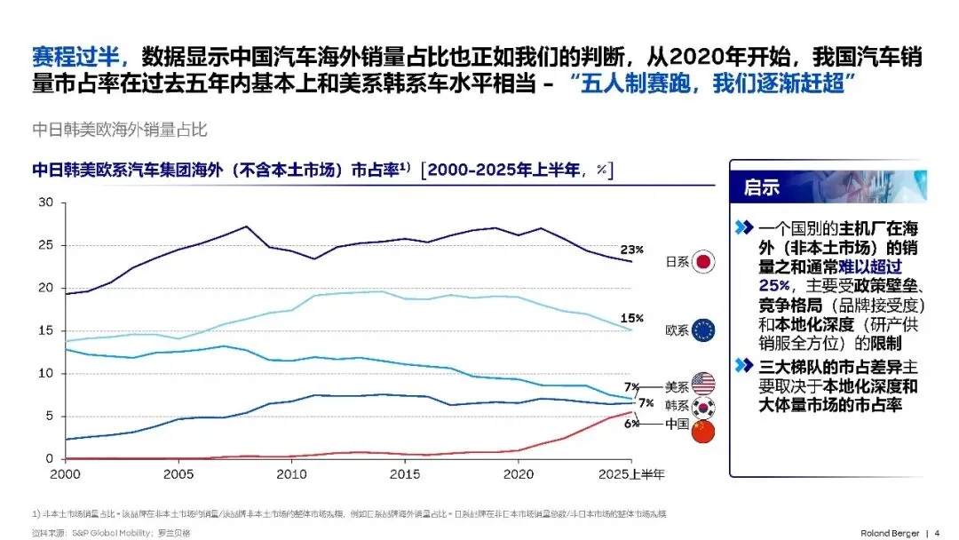 数据显示,中国汽车海外销量占比在过去五年内基本与美系、韩系车相当,呈现出“五人制赛跑,我们逐渐赶超”的态势。2025年上半年,中国汽车海外市占率已达到6%,与美系、韩系车的差距进一步缩小。