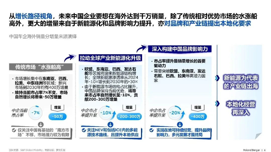 全球新能源汽车市场正在快速增长,预计到2030年,全球新能源渗透率将从2024年的10%增长到超过30%。中国品牌在新能源汽车领域具有显著的技术和成本优势。如果能够保持当前的市场地位,中国品牌有望将市占率自然增长至10%,从而贡献200万至300万辆的增量。这一增长不仅依赖于新能源汽车的发展,还需要中国企业在包括内燃机在内的多能源技术路线上持续投入,同时提升本地供应链能力。