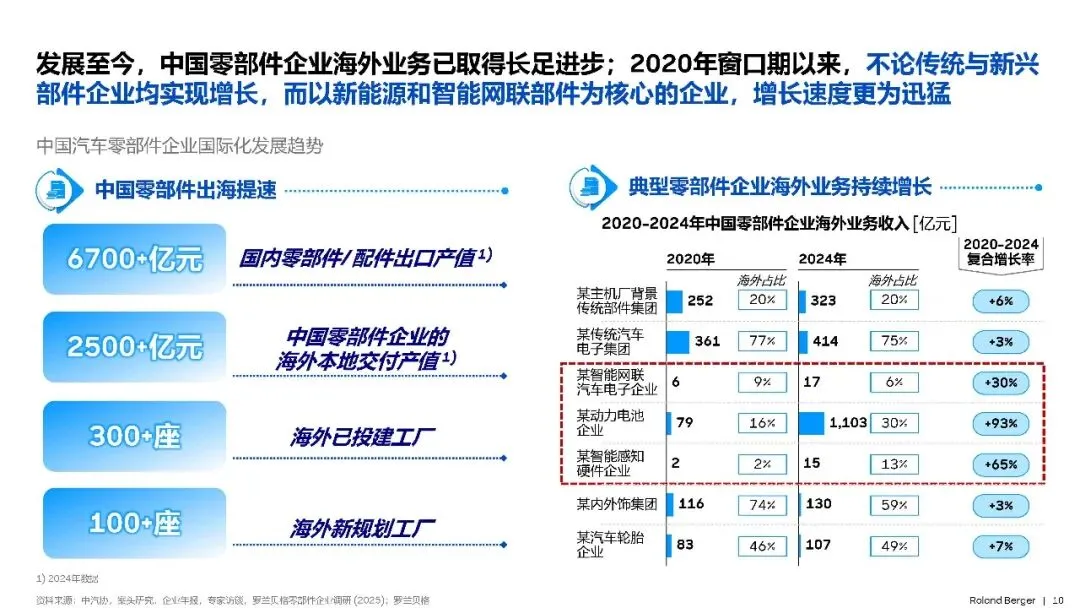 近年来,中国零部件企业在海外业务上取得了长足进步。2020年至2024年,零部件企业的海外业务收入持续增长,其中新能源和智能网联部件企业增长迅猛。