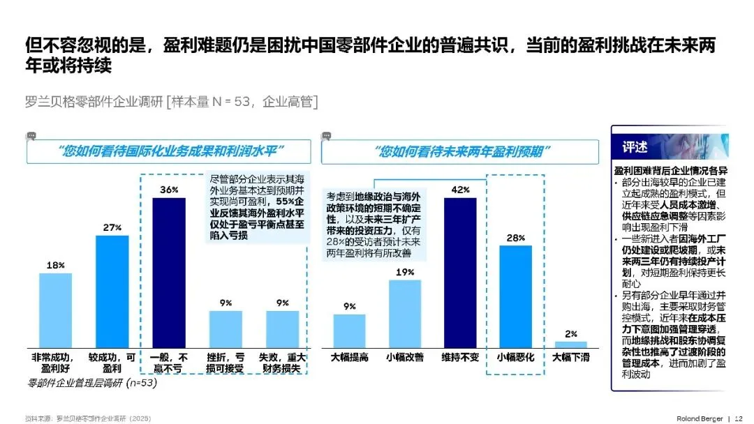 尽管中国零部件企业在海外业务上取得了一定的成绩,但盈利难题仍是普遍存在的问题。调研显示,尽管部分企业表示其海外业务基本达到预期并实现尚可盈利,但仍有55%的企业反馈其海外盈利水平仅处于盈亏平衡点甚至陷入亏损。