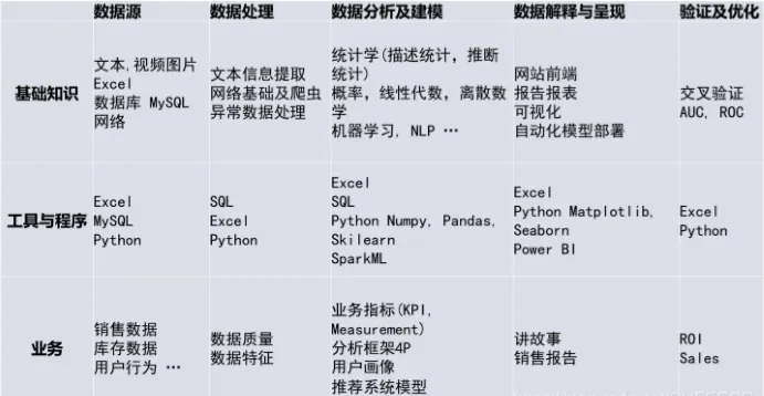 这五个阶段在上述的基础知识、工具和业务能力方面又有不同的要求,具体如下: