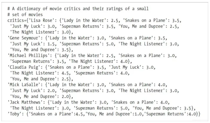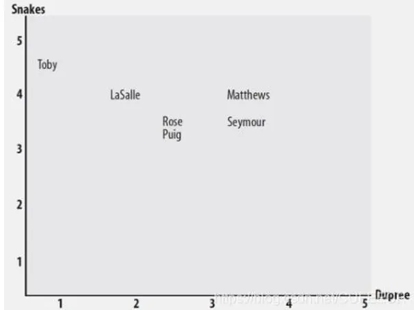 每个人的评分都以坐标的形式体现出来,可以通过两者之间的距离计算出来,距离越近则相似度越高,最简单的方式是通过勾股定理计算;