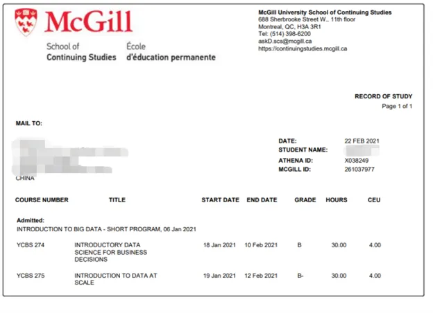 【正式官方项目】学生可获得麦吉尔大学正式的课程成绩单与参课证明。