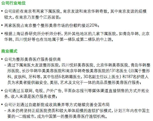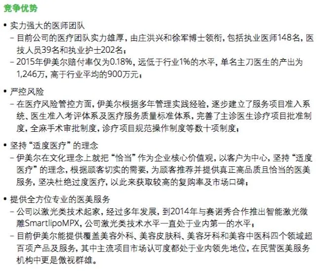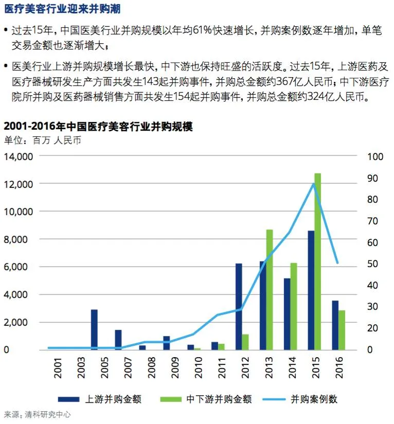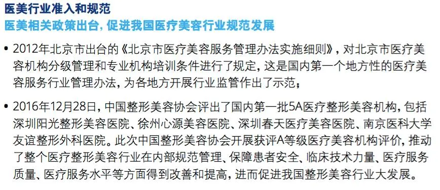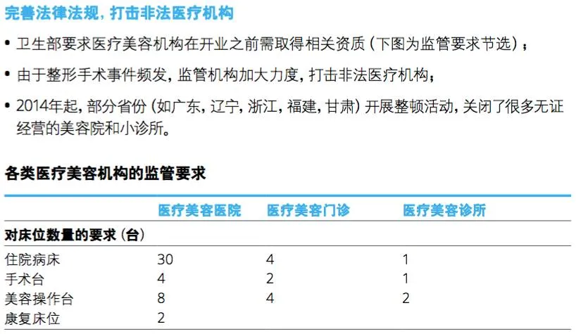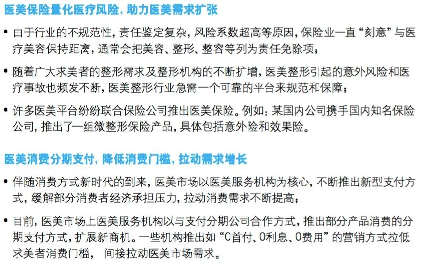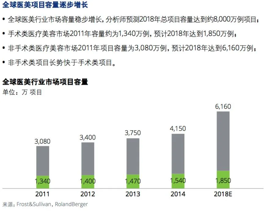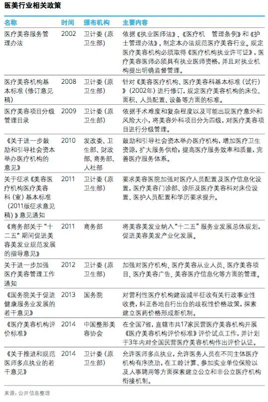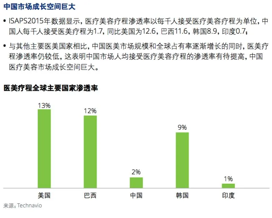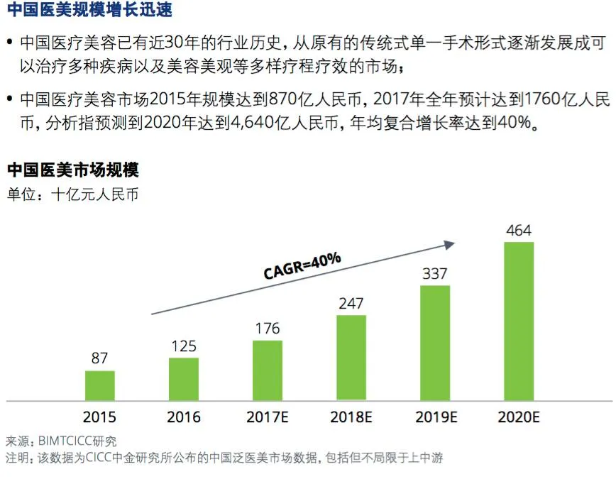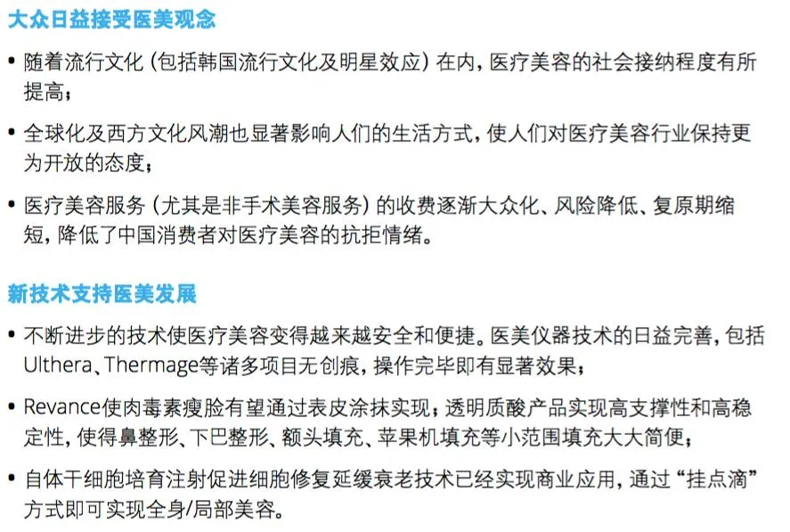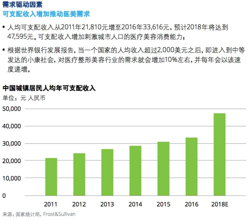 在中国,随着国民可支配收入的提高和对审美要求不断地提升,大众对美的意识越来越强烈,进而对整形美容的需求与日俱增。医疗美容行业将成为一大消费热点。伴随着医疗技术的发展,安全且快捷的医美疗程更能显著满足消费者需求,从而吸引大量的潜在消费群体。与其他行业类似,医美行业的快速增长也需要金融资本的助力与推动。在中国,随着大量资本涌入医美行业,民营和中外合资医美机构应运而生,从而加剧了行业竞争。整体医美行业市场环境预计将在大量机构整合中愈加成熟,并在未来快速发展。