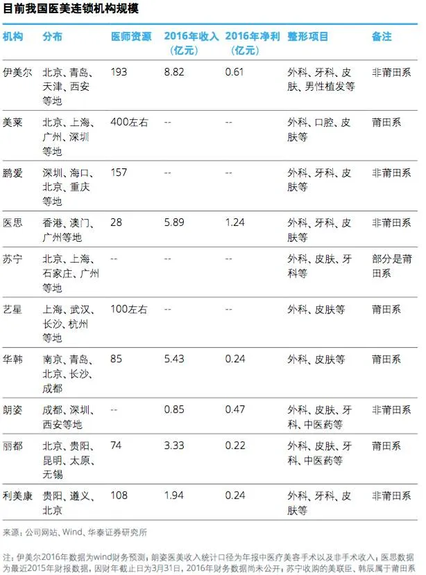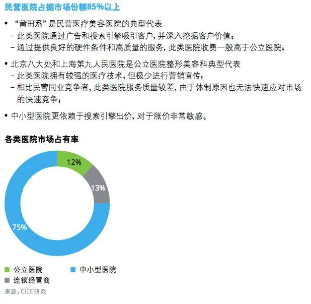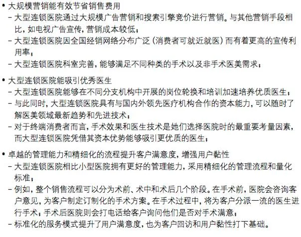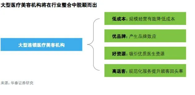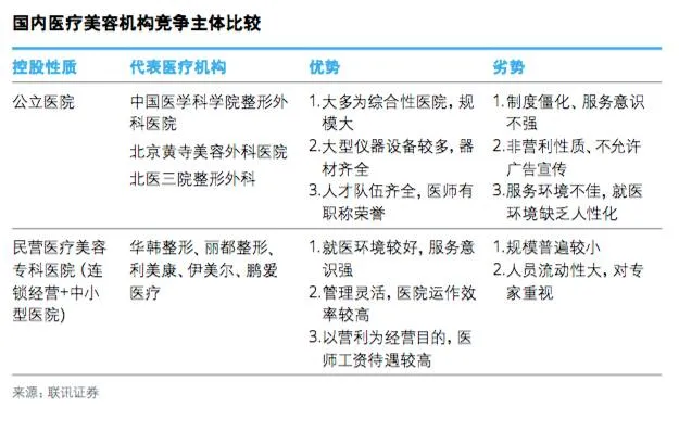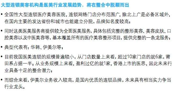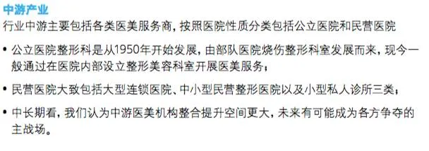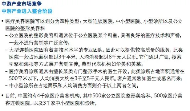 目前公立医院和民营医美服务商在中游产业平分秋色,竞争激烈,行业面临整合,有待具 备规模效应的大型连锁机构脱颖而出。