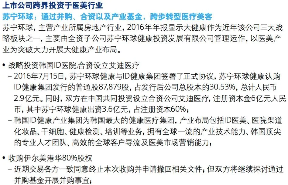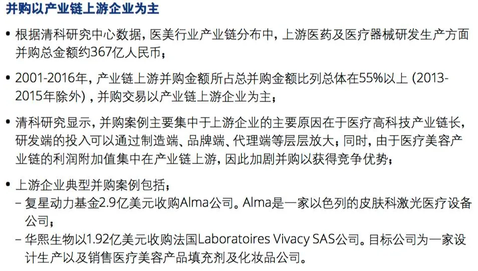 中国医美行业迎来并购潮,新进入者主要以资金雄厚的消费类上市公司为主,产业链上游 并购尤其活跃,主要目的为引进新型技术和产品。