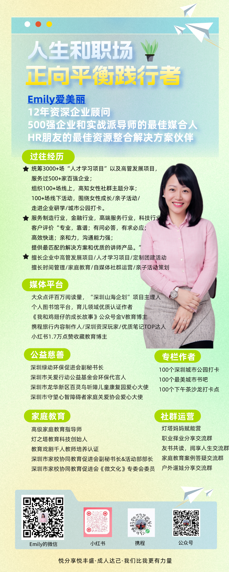 我们还看到,Emily女士不仅精耕于企业中高管发展及人才学习等项目,还是一位综合能力超强的高级家庭教育指导师,在【媒体平台】、【公益慈善】、【社群运营】等领域均有着不俗的建树,拥有着广泛的影响力。同时,她还是多个【专栏】的作者,拥有着深厚的文学素养。