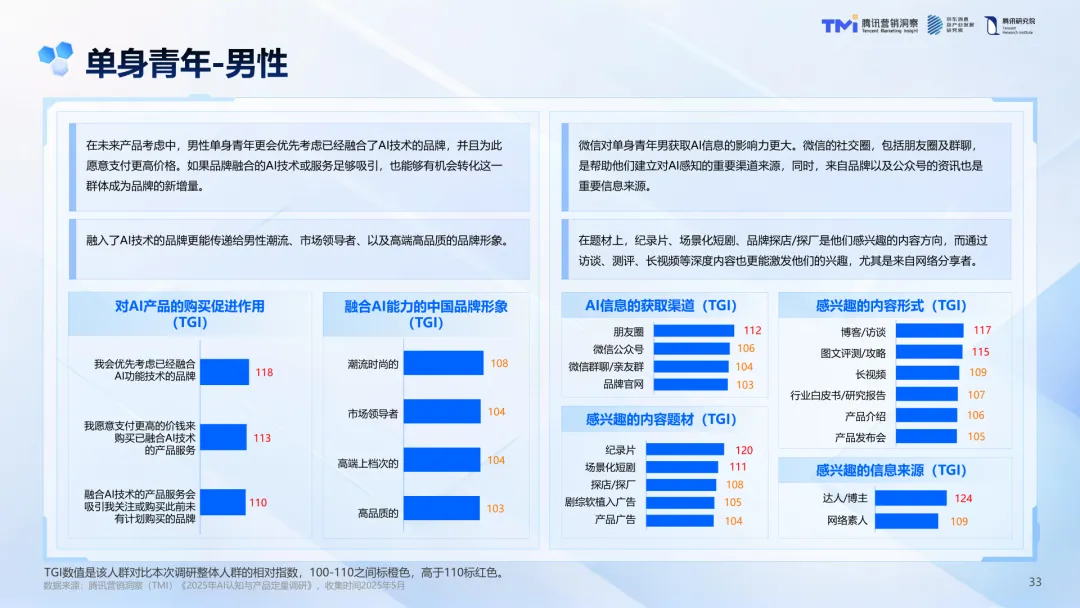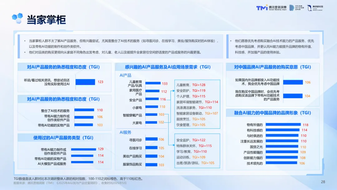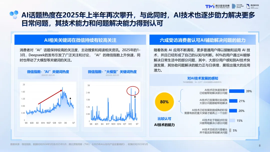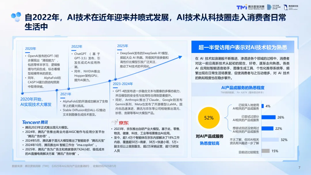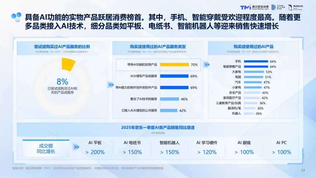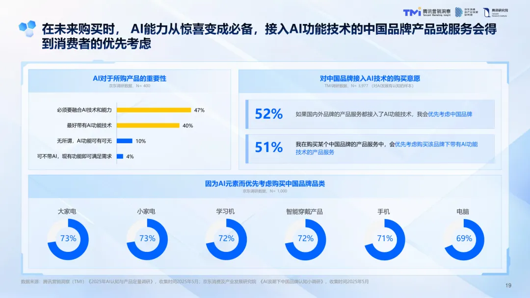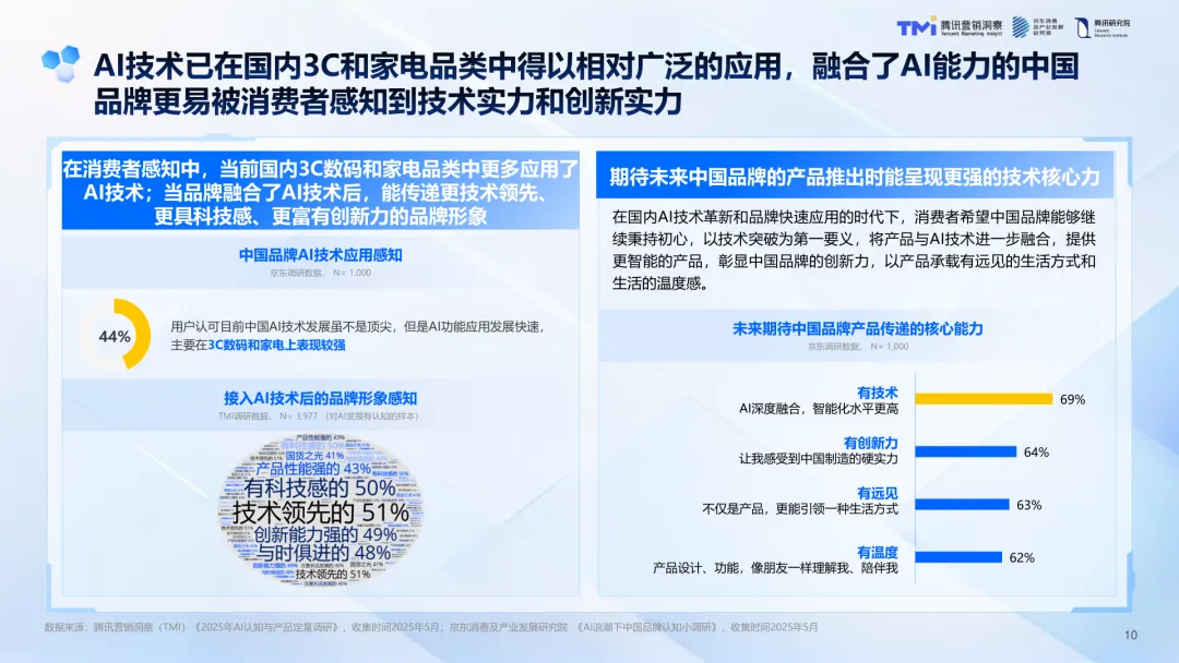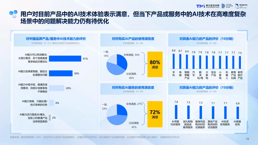 导读:报告基于 4674 份调研样本及京东平台数据,聚焦 AI 技术发展态势与中国品牌应用现状。AI 技术已深度融入消费生活,超半数受访者对 AI 较为熟悉,80% 认可其问题解决能力。国内 AI 技术在 3C 数码、家电等品类应用领先,部分领域与海外水平持平甚至超越,65% 受访者认为其是科技强国的重要赛道。消费者对 AI 产品需求旺盛,智能穿戴、手机、家电等实物产品及在线问诊、试装试妆等服务最受关注,健康管理、学习教育等四大场景为核心需求。职场资深人士、当家掌柜、单身青年是三大核心消费群体,需求各有侧重。中国品牌 AI 产品销售增长显著,近半数消费者将 AI 功能列为购买必备条件。未来,品牌需深化场景化 AI 应用,通过技术科普与产品实测传递价值,依托微信、短视频等渠道触达消费者,打造有技术、有温度的产品体验。