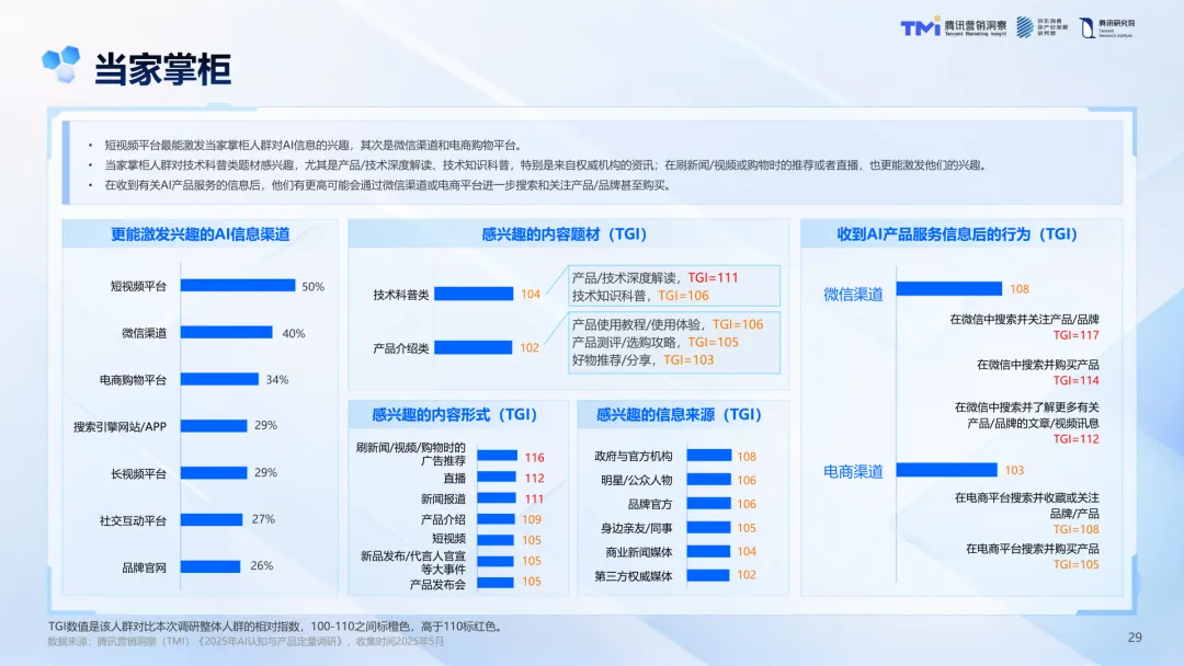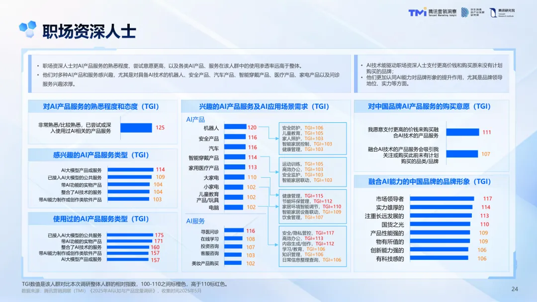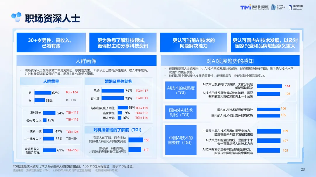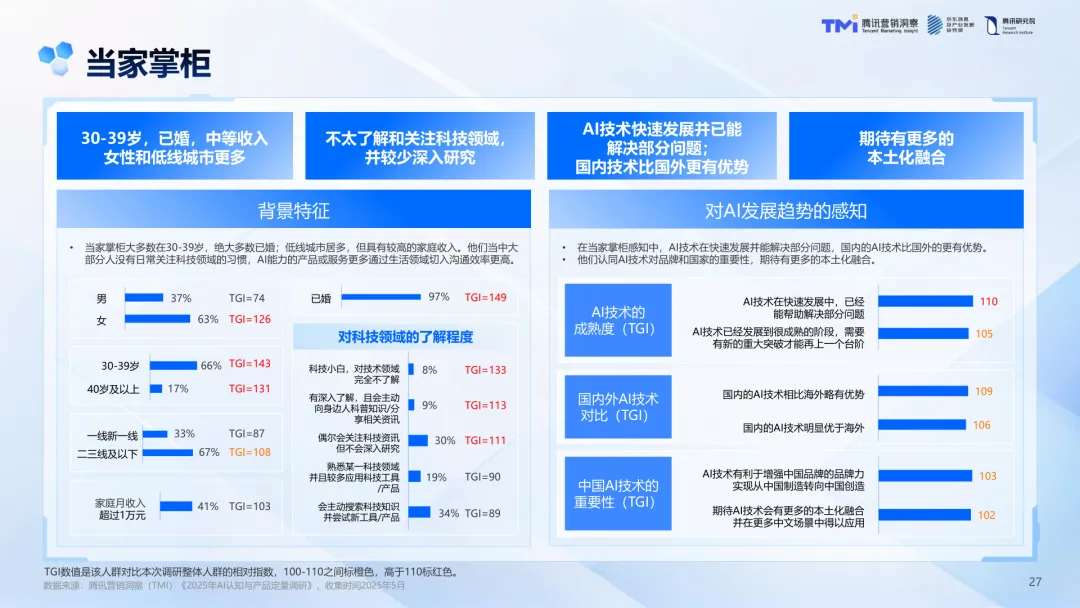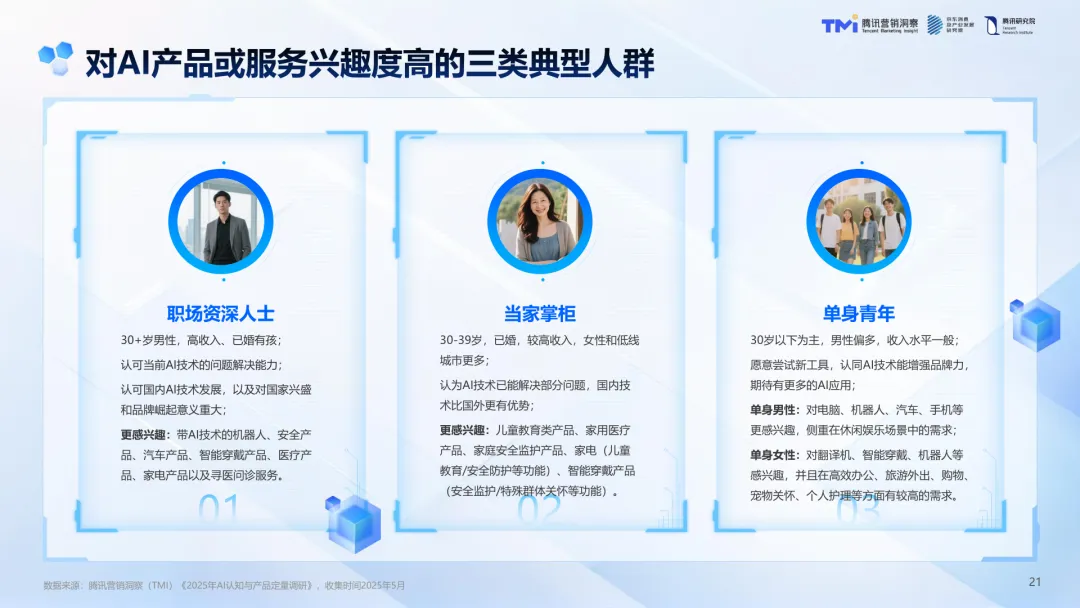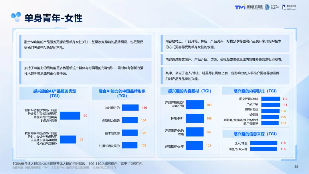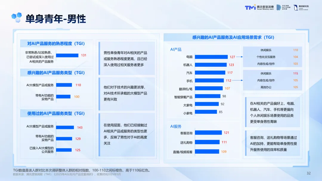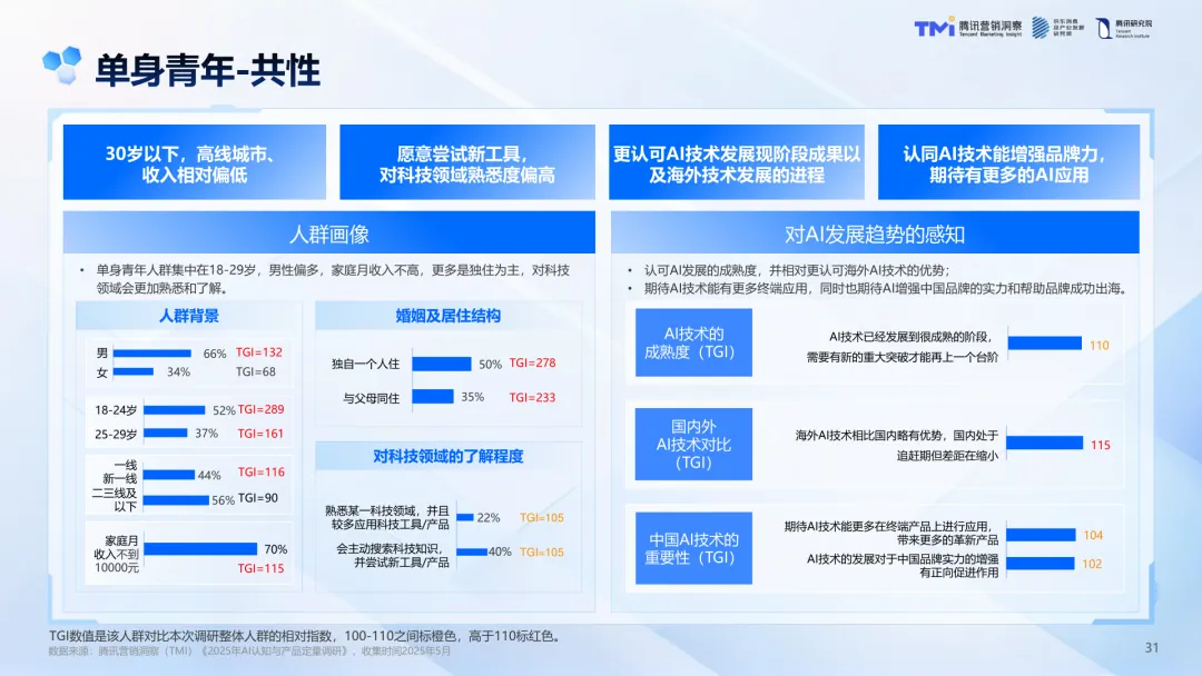 导读:报告基于 4674 份调研样本及京东平台数据,聚焦 AI 技术发展态势与中国品牌应用现状。AI 技术已深度融入消费生活,超半数受访者对 AI 较为熟悉,80% 认可其问题解决能力。国内 AI 技术在 3C 数码、家电等品类应用领先,部分领域与海外水平持平甚至超越,65% 受访者认为其是科技强国的重要赛道。消费者对 AI 产品需求旺盛,智能穿戴、手机、家电等实物产品及在线问诊、试装试妆等服务最受关注,健康管理、学习教育等四大场景为核心需求。职场资深人士、当家掌柜、单身青年是三大核心消费群体,需求各有侧重。中国品牌 AI 产品销售增长显著,近半数消费者将 AI 功能列为购买必备条件。未来,品牌需深化场景化 AI 应用,通过技术科普与产品实测传递价值,依托微信、短视频等渠道触达消费者,打造有技术、有温度的产品体验。