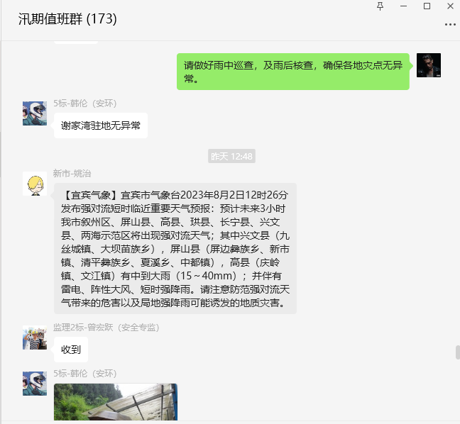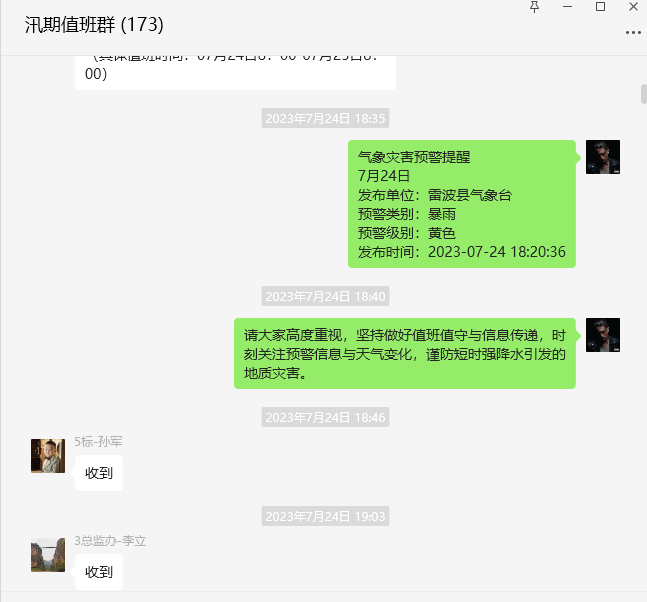 ⭐三是严格落实领导带班和24小时值班制度。密切关注风险较高地区的雨情、水情和天气变化,提前对各管理处、各项目标段做好降雨提示,加强监测预报预警。在接到属地政府部门和上级单位的预警信息后,坚决果断、高效组织调度各参建方及沿线人民群众安全转移,夜以继日、全力以赴,是沿江宜金公司每一名奋战在防汛抢险一线干部职工的真实写照。2023年7月共组织避险撤离34次,累计组织撤离人数2222人。