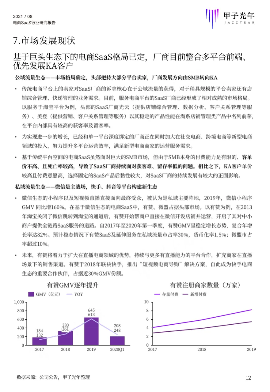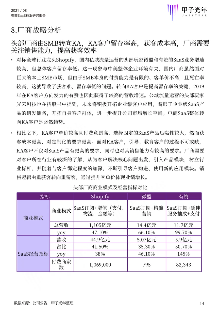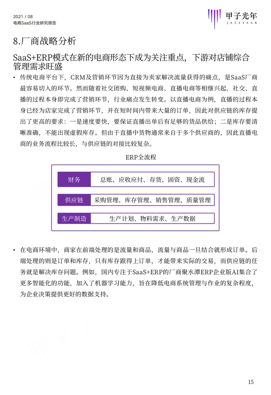 未来,BI+AI技术在各个核心流程中的深度使用将会进一步满足电商卖家的需求,其算力和存储能力的提升将会进一步引导电商进行精细化管理,为商家提供最优的全链路解决方案。同时,随着对下游行业的理解加深,厂商需具备丰富的矩阵式产品以更好地服务不同体量的商家,贴合不同的商家要求。目前私域流量运营缺少平台背书,厂商更需要通过自己的品牌效应消除市场的信任缺失,强品牌效应将帮助厂商构建护城河,下游客户趋向于向赛道头部厂商聚拢。本报告借助甲子光年在科技行业的资源积累,走访多位业内专家,最终输出对中国电商SaaS行业的系统分析、数据洞察和趋势判断,重磅推出此份《2021电商SaaS行业研究报告》——无论你是该行业创业者、投资者、公司中高级管理者,还是关注该行业的相关人士,我们都向您推荐这份全面详细深入的洞察分析。* 点击“阅读原文”跳转至甲子光年官网,注册登录后,即可下载完整版报告。
