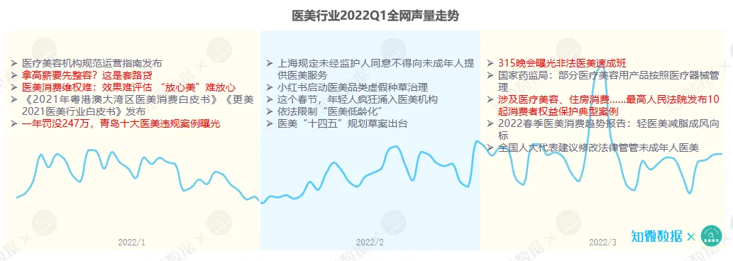 今年第一季度中国医美行业的舆情在强监管、疫情和315的三重压力下,呈现声量总体走低,监督报道量走高的冰火两重天的迹象。