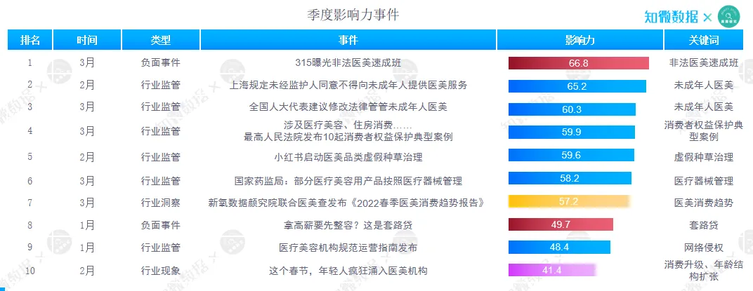 从上图中不难看出,新氧数据颜究院联合医美查发布的《2022春季医美消费趋势报告》几乎成为TOP10舆情影响力事件中唯一的正面声量。