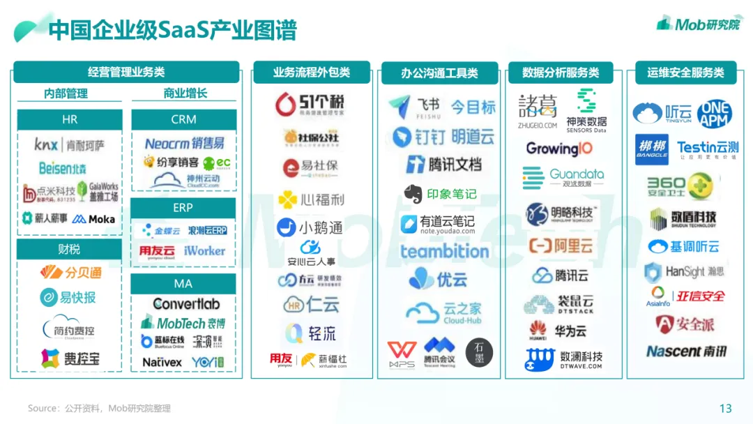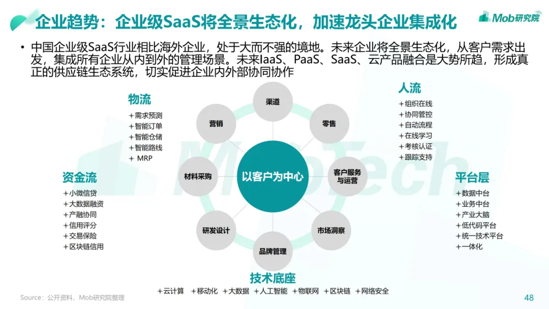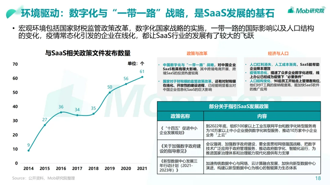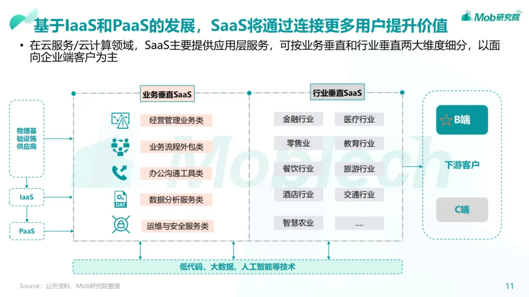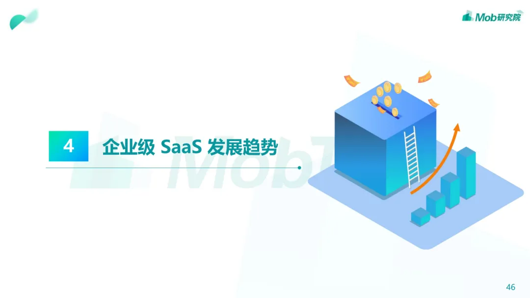 行业现状:整体进入增长爬坡期,经营管理类SaaS已相对成熟• 我国的SaaS行业起步较晚,在2010年左右正式起步,经过十多年的发展,经营管理类SaaS已进入稳定发展的成熟期• 中国企业级 SaaS 品类多样,但相比全球SaaS渗透率还有较大提升空间• 随着数字经济的蓬勃发展以及疫情影响,公众对于SaaS的认知和应用有了更深入的了解,SaaS迎来了快速扩张的机遇• 政策、技术、疫情、市场、资本等都是影响中国企业级SaaS发展的因素。尤其疫情之后的复工复产潮将进一步凸显企业级SaaS• 经营管理类SaaS市场覆盖面较广,CRM、ERP、HCM、客服以及财税品类占比最高• 低代码赛道虽处于发展早期,但未来上升空间较大,原因在于低代码能够让业务人员用低代码产品提供的基础组件快速搭建出行业趋势:百花齐放,技术革新将带来企业和产品的改革• 企业:企业级SaaS全景生态化,加速龙头企业集成化• 产品:垂直化逐渐深入,MarTech赛道将迎来新机遇下载链接:
