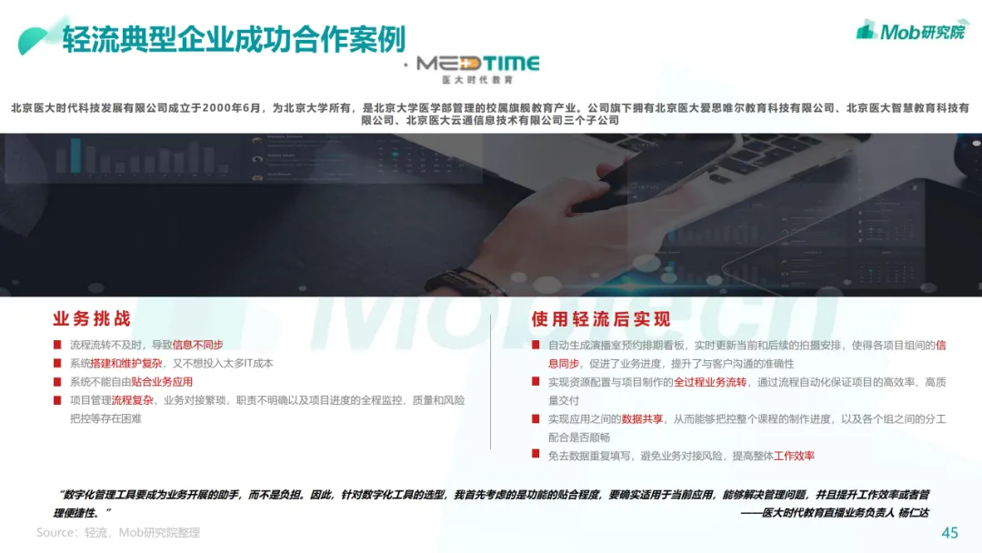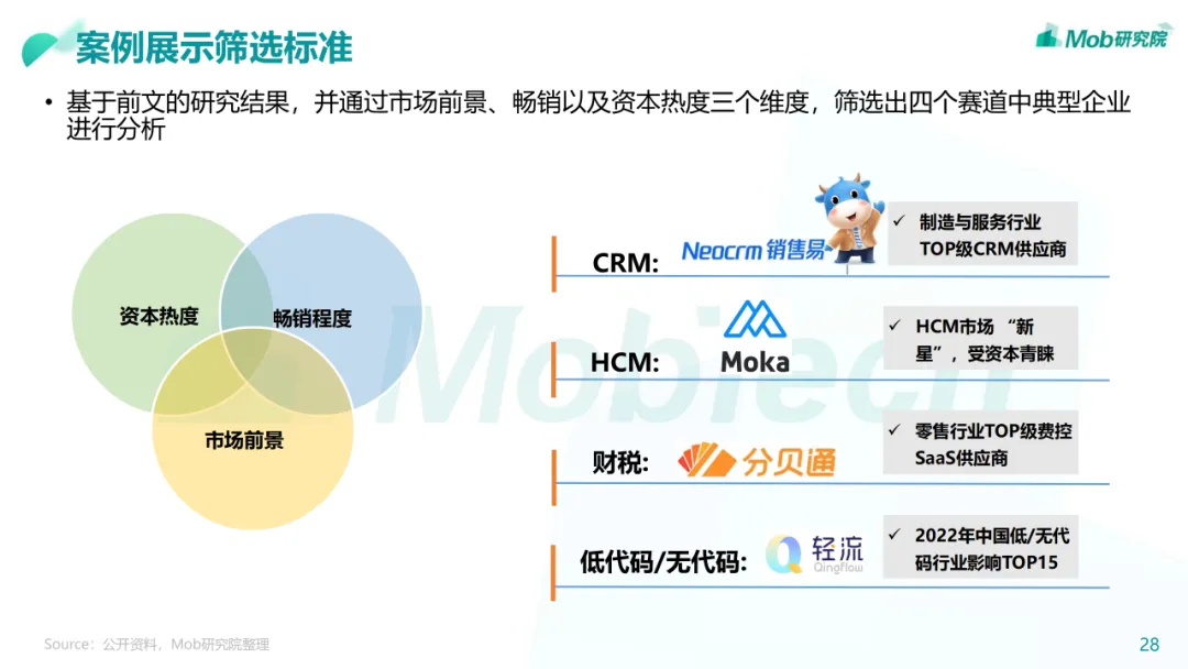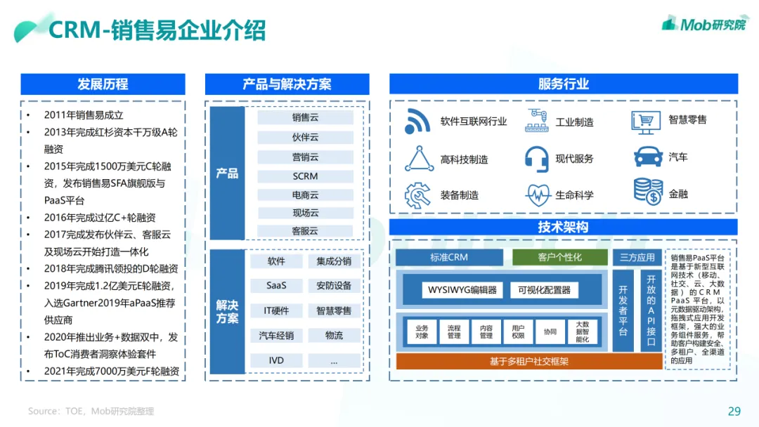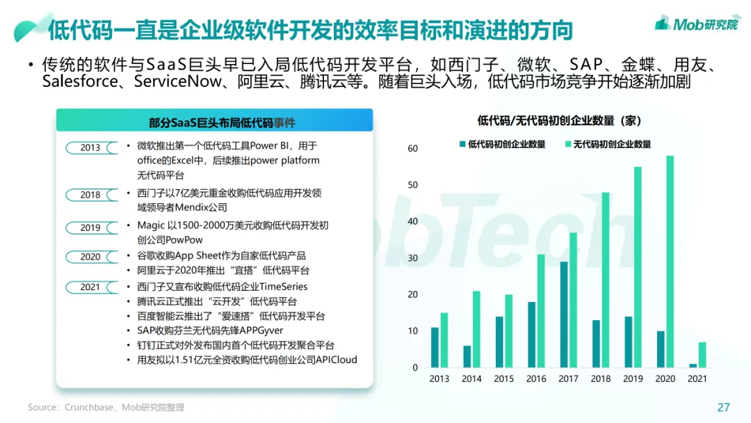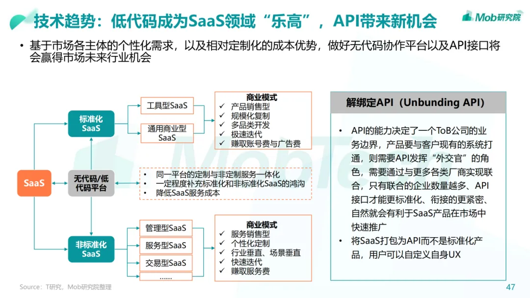 行业现状:整体进入增长爬坡期,经营管理类SaaS已相对成熟• 我国的SaaS行业起步较晚,在2010年左右正式起步,经过十多年的发展,经营管理类SaaS已进入稳定发展的成熟期• 中国企业级 SaaS 品类多样,但相比全球SaaS渗透率还有较大提升空间• 随着数字经济的蓬勃发展以及疫情影响,公众对于SaaS的认知和应用有了更深入的了解,SaaS迎来了快速扩张的机遇• 政策、技术、疫情、市场、资本等都是影响中国企业级SaaS发展的因素。尤其疫情之后的复工复产潮将进一步凸显企业级SaaS• 经营管理类SaaS市场覆盖面较广,CRM、ERP、HCM、客服以及财税品类占比最高• 低代码赛道虽处于发展早期,但未来上升空间较大,原因在于低代码能够让业务人员用低代码产品提供的基础组件快速搭建出行业趋势:百花齐放,技术革新将带来企业和产品的改革• 企业:企业级SaaS全景生态化,加速龙头企业集成化• 产品:垂直化逐渐深入,MarTech赛道将迎来新机遇下载链接: