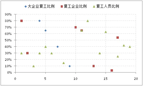 1、从企业规模来看:大型企业复工比例明显高于中小型企业。大型企业复工比例达87.2%,分别高于中型企业和小型企业21.8和52.5个百分点,有65.3%的小型企业暂未复工。