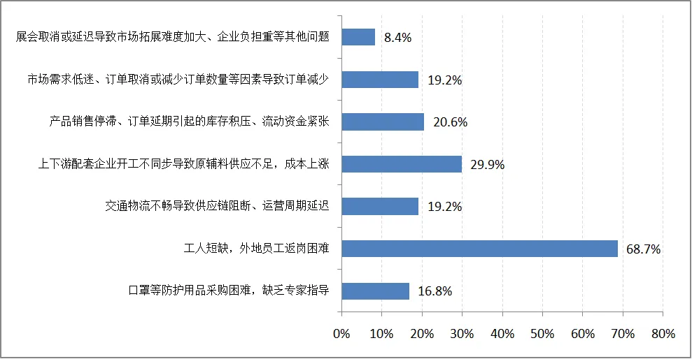 此外,订单不足、防护用品采购困难也是行业当前复工复产面临的主要问题。调查结果显示,19.2%的调查企业反映由于市场需求低迷、外商订单取消或减少订单数量等因素导致订单减少,后续订单在疫情防控、消毒检疫等方面要求更加严格,一定程度上加快了订单向海外转移速度;16.8%的调查企业反映防疫用品采购困难导致复工延迟,特别是复工后疫情防控压力愈加凸显。