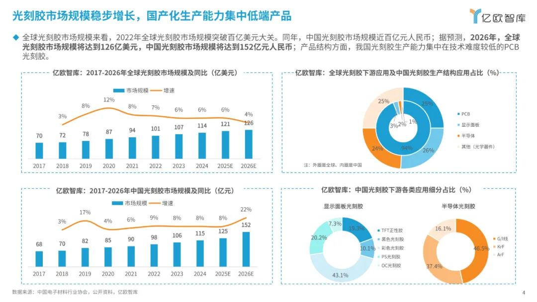 增长势头相当明确。2022年市场规模已接近百亿,按照现有趋势,到2026年有望攀升至152亿元,多年来始终保持着稳定增速。核心难题还是集中在国产化结构失衡上。低端PCB光刻胶占了国内生产的94%,即便如此,其中干膜光刻胶的国产化率也仅5%。中高端领域更显薄弱,LCD彩色/黑色光刻胶国产化率同样只有5%,半导体ArF光刻胶仅有极少量量产,EUV光刻胶目前还处在研发阶段。更关键的是,树脂、光引发剂等核心原材料,以及EUV光刻机这类生产设备,大多依赖进口,这也是当前国产替代路上的主要卡点。