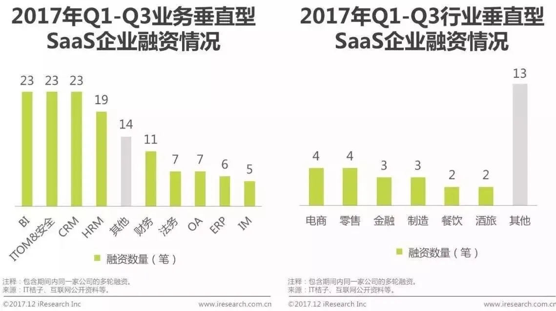 梳理2017年Q1-Q3国内SaaS领域在一级市场的融资事件,共有169笔融资。从业务垂直型市场来看,BI大数据分析、运维管理与安全、CRM(尤其是营销)更受到一级市场青睐,其次为HRM领域。而行业垂直型市场则呈现出高度碎片化特征,在特定垂直行业中获得融资超过2笔的仅有电商、零售、金融、制造等少数行业。